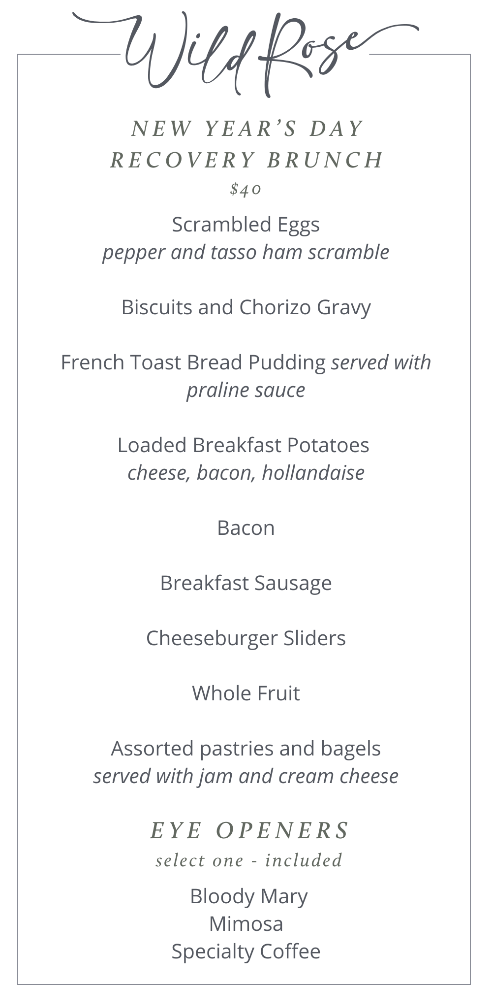 Start the year on a delicious note with our hearty New Year’s Day Recovery Brunch at Wild Rose. From comforting classics to bold flavors that bring you back to life, our menu is crafted to help you ease into 2026 feeling recharged and ready. Whether you’re recovering from the night before or simply savoring a cozy start to the year, Wild Rose is the perfect place to gather, refuel, and welcome what’s next.